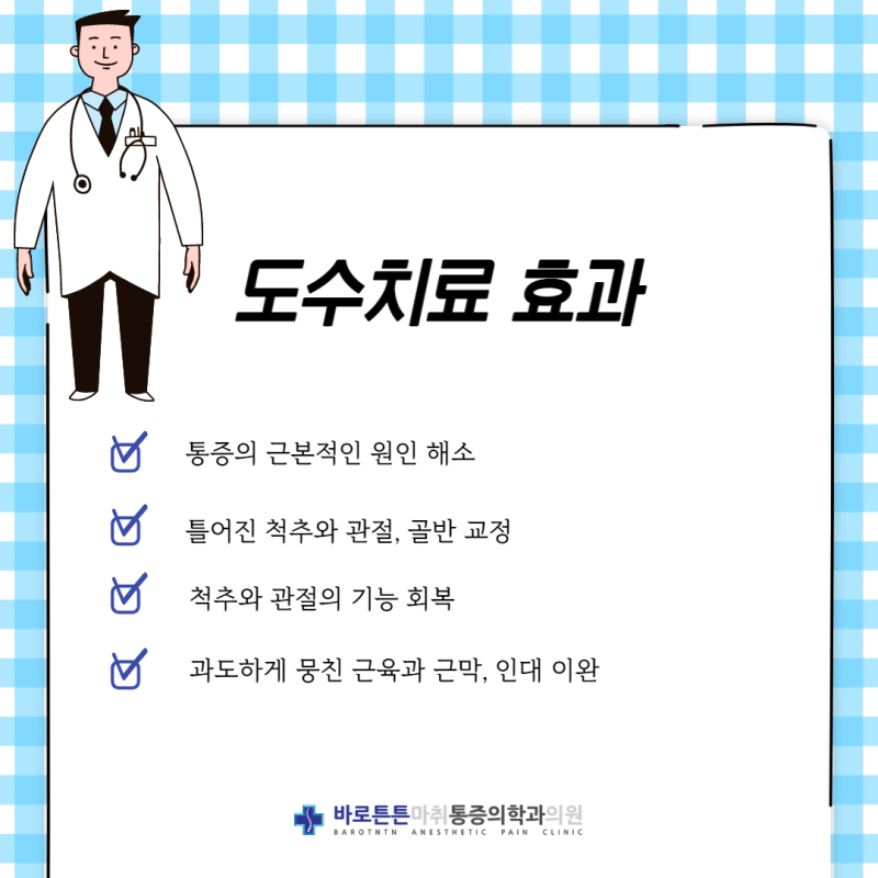 도수치료란?먼저도수치료란정확하게무엇일까요?도수치료란 전문교육을 이수한 물리치료사가 맨손으로 뒤틀린 척추·관절을 바로잡고 통증을 치료하는 환자 맞춤형 비수술적 치료를 말합니다.손으로 하기 때문에 ‘수기 치료’라고 표현하기도 합니다.가끔 도수치료를 마사지로 오해하실 때가 있습니다만, 이것은 잘못된 정보입니다.일반적으로 우리가 말하는 마사지란 통증을 완화하기 위해 아픈 부위의 근육통을 풀어주는 하나의 방법이지 치료가 아닙니다.한편 도수치료는 의사가 통증의 원인을 정확히 진단하는 것으로 시작되는 ‘치료’에 해당합니다.따라서 도수치료는 의사의 진단(처방전) 없이는 할 수 없습니다.의사가 신체검진과 객관적인 영상자료(X-ray, 초음파, MRI 등)를 종합하여 환자의 상태, 나이, 평소 생활습관, 활동력 등을 고려하여 맞춤형 치료가 이루어집니다.
