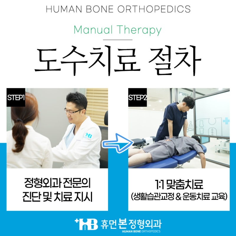 휴먼본 도수치료의 차별점(특별함) 첫째, 정형외과 전문의 처방에 따라 안전하게 치료합니다.휴먼본의 ‘모든’ 도수치료, 물리치료, 운동요법, 수술후재활은 수술 및 임상경험이 풍부한 정형외과 의사의 진단 및 치료지시(*영상진단자료 근거)에 의거 도수치료가 꼭 필요한 분에게만 처방하여 시행하고 있습니다.#계양구성형외과는 무분별한 도수치료를 시행하지 않습니다.둘째, 실제로 배구 국가대표 선수를 치료하는 대한배구협회 국가대표 의무분과위원회의 테라피스트가 진행합니다.따라서 그동안 오랫동안 국가대표 선수를 치료하면서 쌓은 노하우와 경험을 환자에게 1:1 맞춤 적용하고 있어 어느 병원에서도 받아보지 못한 수준 높은 도수치료를 받을 수 있습니다.둘째, 넓은 운동 치료실을 가지고 있는 병원은 많지 않습니다.제대로 된 고가의 치료기기를 갖춘 넓은 운동치료실을 갖춘 병원은 많지 않습니다.넓은 운동치료실에서 슬링치료장비, 세계적인 명품 피트니스 브랜드(테크노짐) 전문 운동장비, 각종 운동소품을 통해 통증을 개선할 수 있는 1:1 맞춤형 재활운동 치료를 받으실 수 있습니다.넷째, 리엔더 테이블을 이용한 카이로프랙틱 치료/전문장비, 소품을 이용한 수술 후 재활운동을 실시합니다.카이로프랙틱 고급과정을 수료한 테라피스트가 카이로프랙틱 테크닉 중 하나인 리엔더 테이블을 이용하여 자세교정, 일그러진 체형균형, 통증을 효과적으로 치료합니다.결국 가장 중요한 것은?치료사의 실력입니다.실력있는 테라피스트란 환자의 상태를 정확하게 파악한 후 적절한 운동법, 어느 정도면 치료를 마칠 수 있는지 치료 시작~끝까지 맞춤형 플랜을 세워주는 테라피스트가 아닐까요?치료사의 기술은 하룻밤 사이에 완성되는 것이 아닙니다. 많은 시간 동안 풍부한 치료 경험을 쌓아야 합니다.근골격계 해부학적 지식과 풍부한 경험을 갖춘 치료사가 있는 병원을 선택하시면 비용도 절감할 뿐만 아니라 치료 시간도 단축됩니다.이점 꼭 기억해주세요!휴먼본 도수치료 어떤 절차로 받을 수 있나요?우선 정형외과 전문의의 진단과 치료 지시가 필요합니다.의사가 처방전을 발급하면 테라피스트가 환자의 영상 진단 결과를 토대로 관절 가동 범위, 상태를 정확하게 평가한 후 1:1 맞춤 도수 치료를 합니다.환자의 상태별로 단계별 점진적 도수치료를 실시합니다.휴먼본에서는 환자의 통증 유발 습관을 바로잡고 치료가 끝난 후에도 스스로 재발을 방지할 수 있는 자기 운동법을 교육하고 있습니다. 끊임없이 공부하고 연구하는 휴먼본 도수치료팀!휴먼본은 2019년 개원 이래 일주일도 빠짐없이 매주 월요일 오전 매일 아침 도수&재활 컨퍼런스를 진행하고 있습니다.부평성형외과: 휴먼본뉴스: 도수 및 재활 컨퍼런스, 운동영상촬영 스케치! 안녕하세요. 부평시장역에 위치한 휴먼본성형외과입니다. 오늘은 오랜만에 휴먼책 정형외과 활동 소식을…blog.naver.com부평성형외과: 휴먼본뉴스: 도수 및 재활 컨퍼런스, 운동영상촬영 스케치! 안녕하세요. 부평시장역에 위치한 휴먼본성형외과입니다. 오늘은 오랜만에 휴먼책 정형외과 활동 소식을…blog.naver.com개인 치료실 전용면적 240평/2개 전층을 사용합니다.5층::진료센터 4층:도수,운동,물리치료센터 도수치료실:개별분리8실 운동치료실 물리치료실:개별분리20침대휴먼본 비수술치료의 대부분 관절·척추질환은 초기에 치료하면 수술 없이 비수술적 치료를 통해 해결할 수 있습니다.통증을 방치하지 마시고 신속하게 #계양구 정형외과를 내원하여 저에게 최적의 1:1 맞춤형 비수술적 치료를 시작해 보세요. 직장인분들도 퇴근 후 편안하게 야간진료를 받으실 수 있습니다.(월, 수, 금 저녁 9시까지 치료)월수금 오전 9:00~오후 9:00 야간진료 시행 화목 오전 9:00~오후 7:00 토요일 오전 9:00~오후 2:00(*점심휴무 없이 진료) 휴먼본성형외과 예약하기휴먼본성형외과의원 : 네이버 방문자 후기 1,326 블로그 리뷰 381naver.me휴먼 본 정형외과에 전화문의032-272-7979 (*모바일 클릭시 연결됩니다) 휴먼본성형외과 위치안내인천1호선 부평시장역 4번출구 앞 1호선 부평역 6번출구로 나와 직진(*도보 10분이내)휴먼본성형외과의원 인천광역시 부평구 부평대로 83 강남타워 4~5층, 부평성형외과: 인천광역시 부평구 부평동 529-5 부평강남타워(4, 5층) 지하철 이용시 1. 인천 1호선 부평시장역: 4번휴먼본성형외과의원 인천광역시 부평구 부평대로 83 강남타워 4~5층, 부평성형외과: 인천광역시 부평구 부평동 529-5 부평강남타워(4, 5층) 지하철 이용시 1. 인천 1호선 부평시장역: 4번휴먼본성형외과의원 인천광역시 부평구 부평대로 83 강남타워 4~5층, 부평성형외과: 인천광역시 부평구 부평동 529-5 부평강남타워(4, 5층) 지하철 이용시 1. 인천 1호선 부평시장역: 4번휴먼본성형외과의원 인천광역시 부평구 부평대로 83 강남타워 4~5층, 부평성형외과: 인천광역시 부평구 부평동 529-5 부평강남타워(4, 5층) 지하철 이용시 1. 인천 1호선 부평시장역: 4번