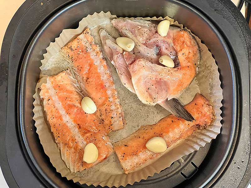 에어프라이어 메뉴에 생선구이 설정이 있으면 선택하고, 없으면 180도에서 20분간 돌린다. 창문으로 한번 확인해보세요. 연어유가 많이 나오게 됩니다. 종이 호일을 사용하면 설거지의 번거로움을 덜 수 있습니다.